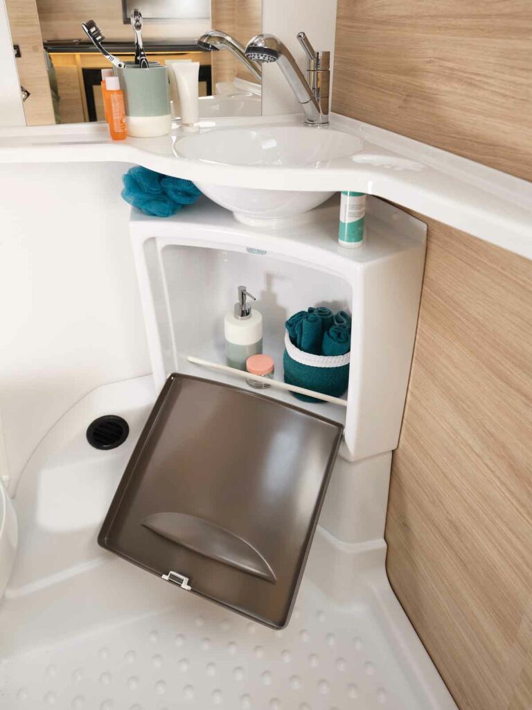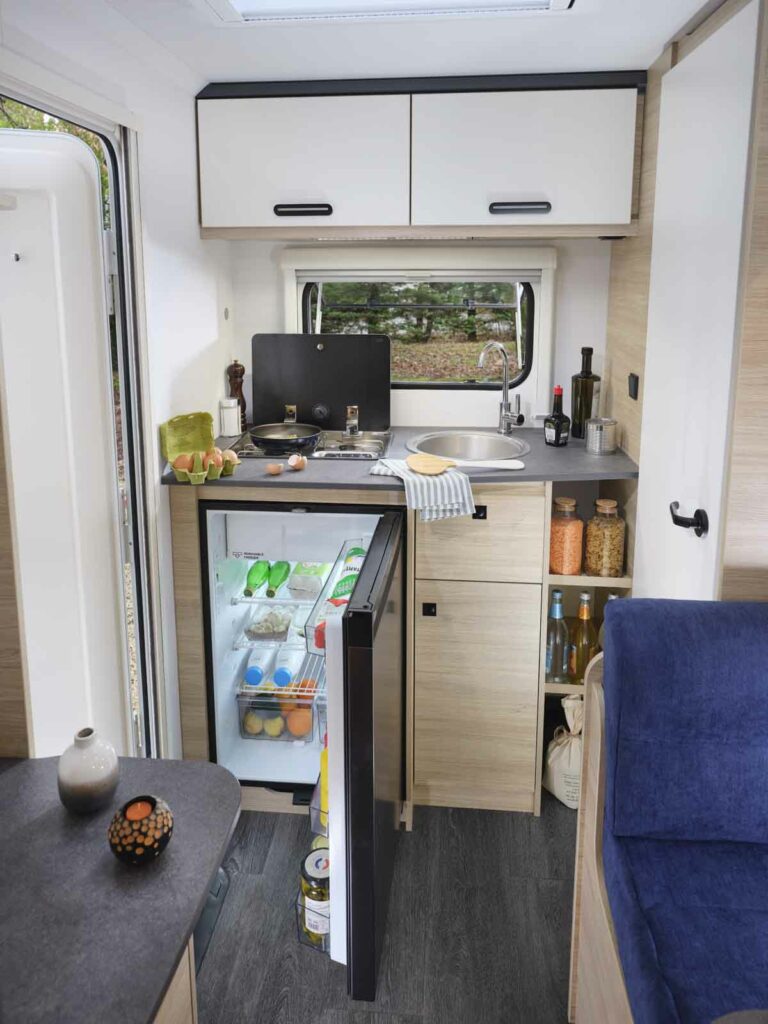 Amerete vivere, cucinare e muovervi in questa roulotte perfettamente organizzata. Lo spazio cucina offre un piano di lavoro di 120 cm