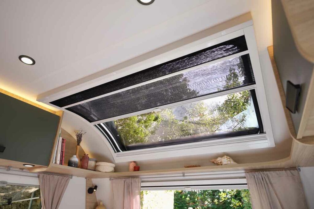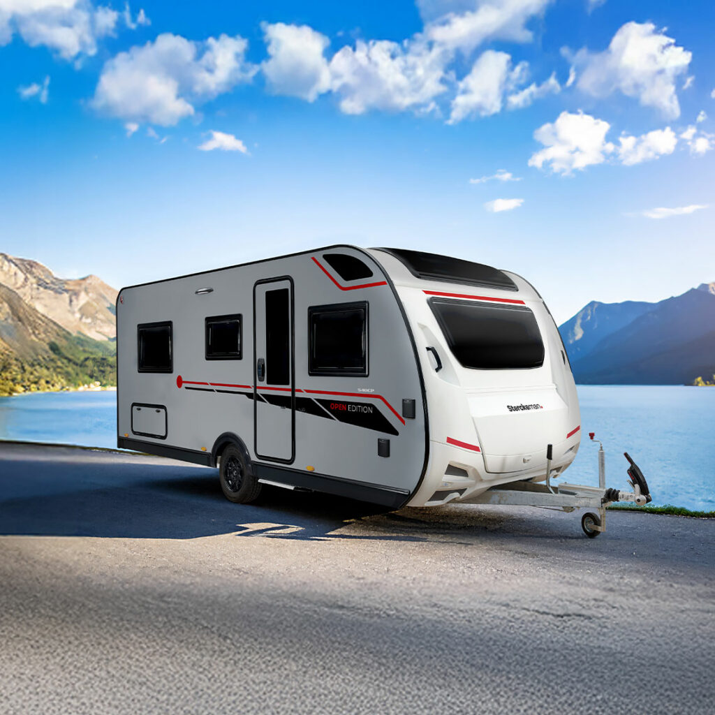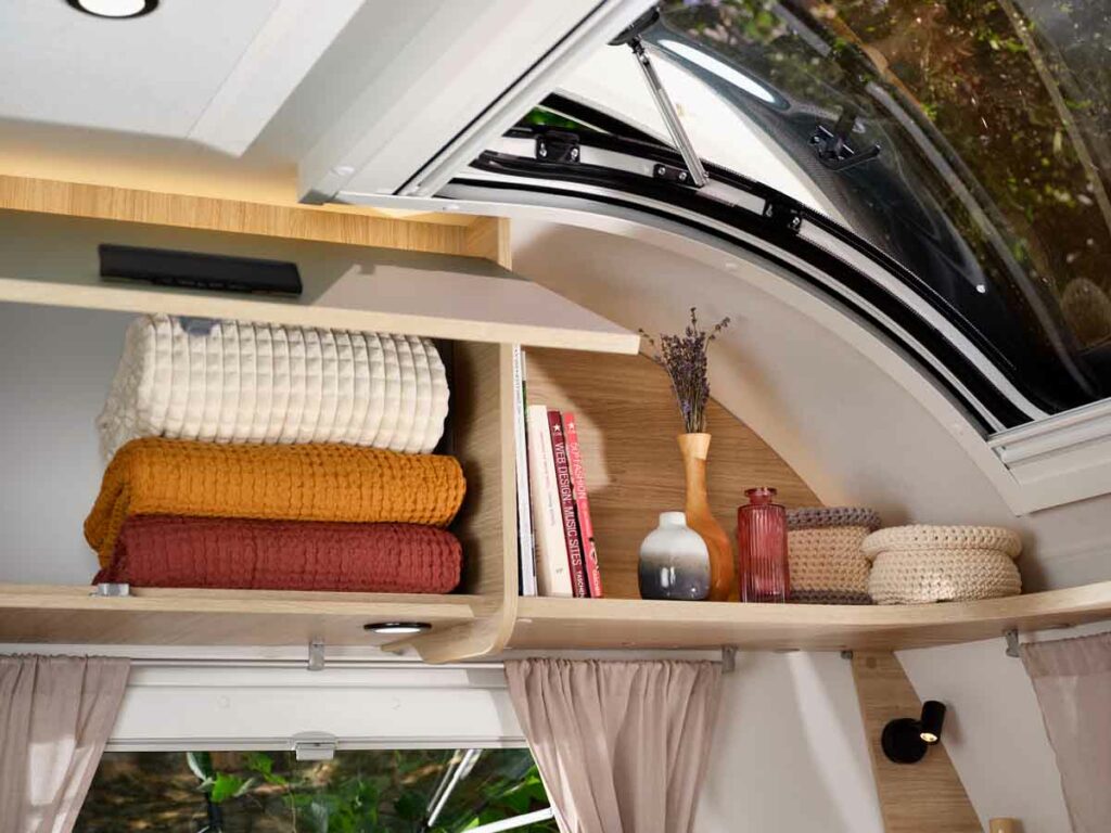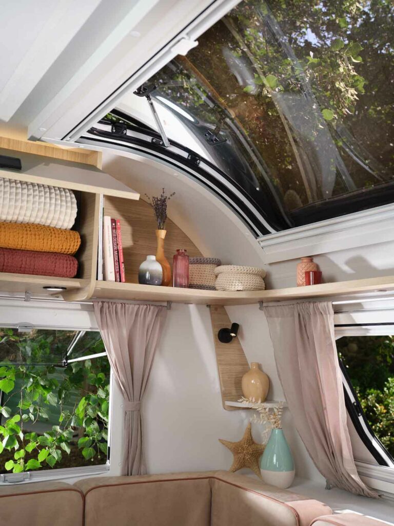 Una roulotte di alta gamma con un letto alla francese, un bagno, un salotto a U e numerosi spazi di stivaggio.
