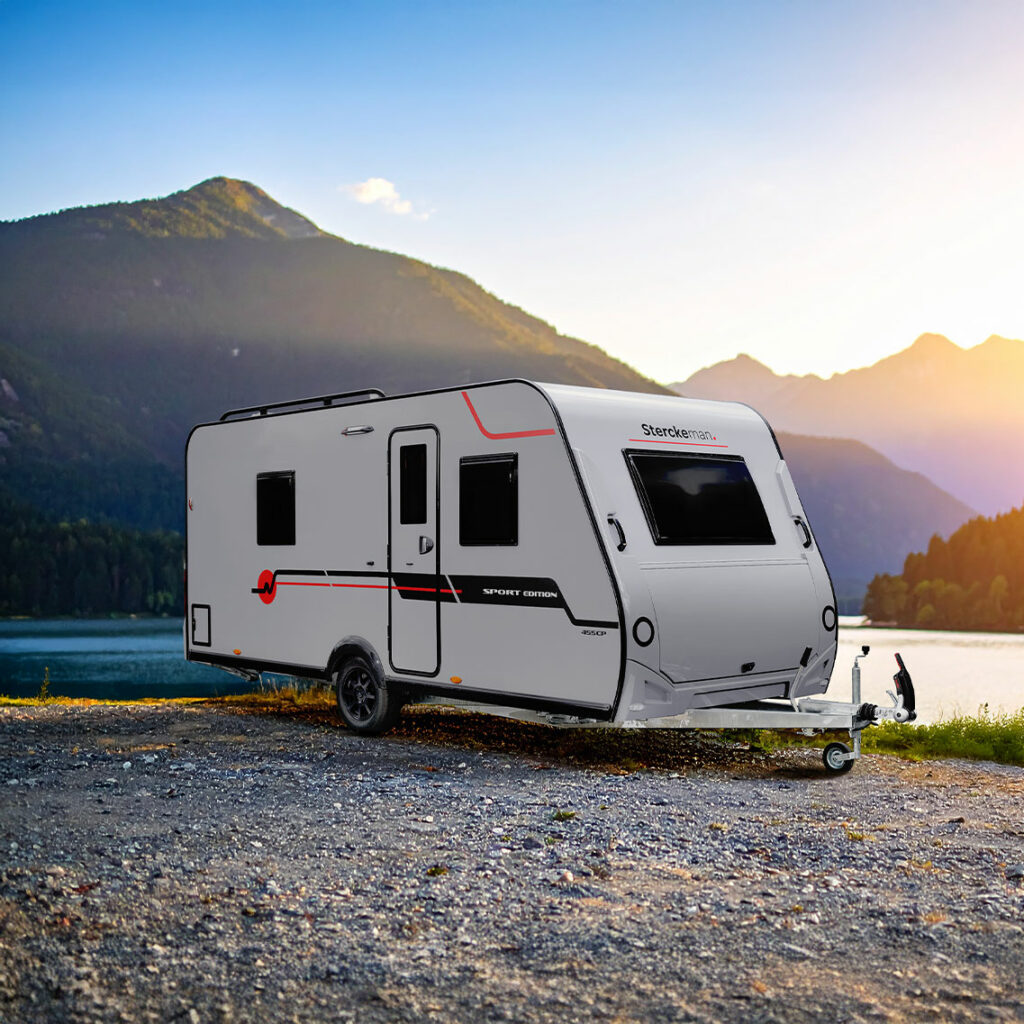 Misura solo 4.70 m di lunghezza interna eppure troverete nella caravan Sport Edition 476PE, un maxi salone, un bagno con lavabo, letti a castello per i bambini e un garage accessibile dal lato del tendalino.